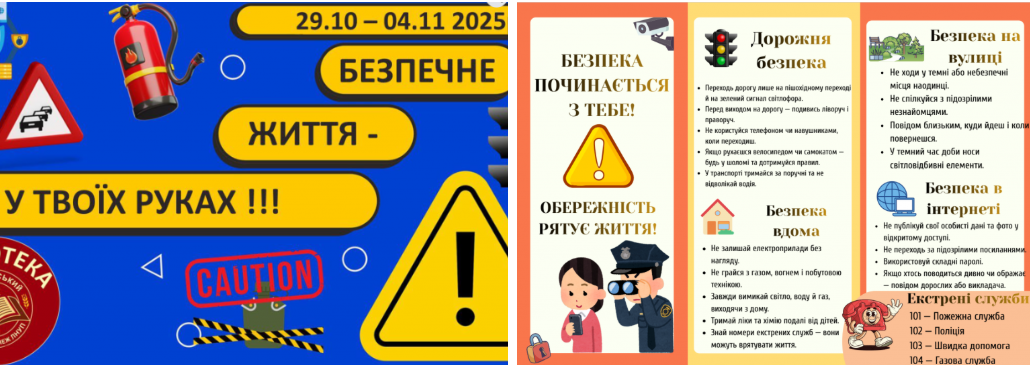 У межах Тижня завідувачка бібліотеки Катерина Моцьо та провідний бібліотекар Ірина Сергєєва організували тематичну виставку «Безпечне життя – у твоїх руках», де було представлено літературу та періодичні видання з питань цивільного захисту, пожежної безпеки, охорони праці, домедичної допомоги та поведінки під час воєнного стану. Виставка сприяла формуванню культури безпечної поведінки та підвищенню поінформованості здобувачів освіти.Куратори академічних груп провели виховні години та бесіди з питань безпеки життєдіяльності, використовуючи рекомендації Міністерства освіти і науки України, відеоматеріали ДСНС.Студенти підготували тематичні буклети «Пам’ятай про безпеку!», які стали ще одним кроком до усвідомлення: Безпека кожного починається з особистої відповідальності.